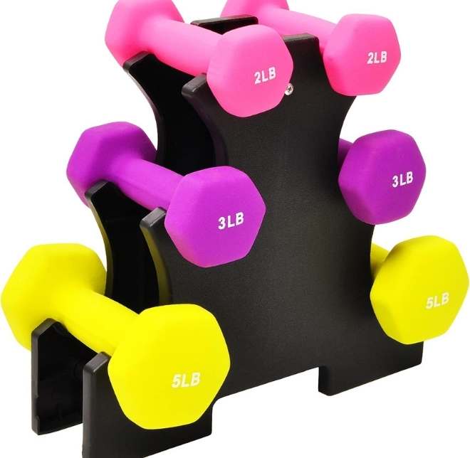 - 3 pairs of dumbbells in 2-pound, 3-pound, and 5-pound sizes. Ideal for resistance and other trainings